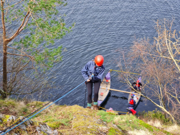 Following a few hours’ sleep – thanks to the family of geese making their presence well known! – it was time to pack up camp and wend our way back to base over land, air and water. A hike from Angle Tarn to a forested area above Blowick Bay brought us to the abseil point. Once again, mettle was tested as we each tipped over the cliff-edge and descended down to a narrow ledge before settling into rafted canoes.